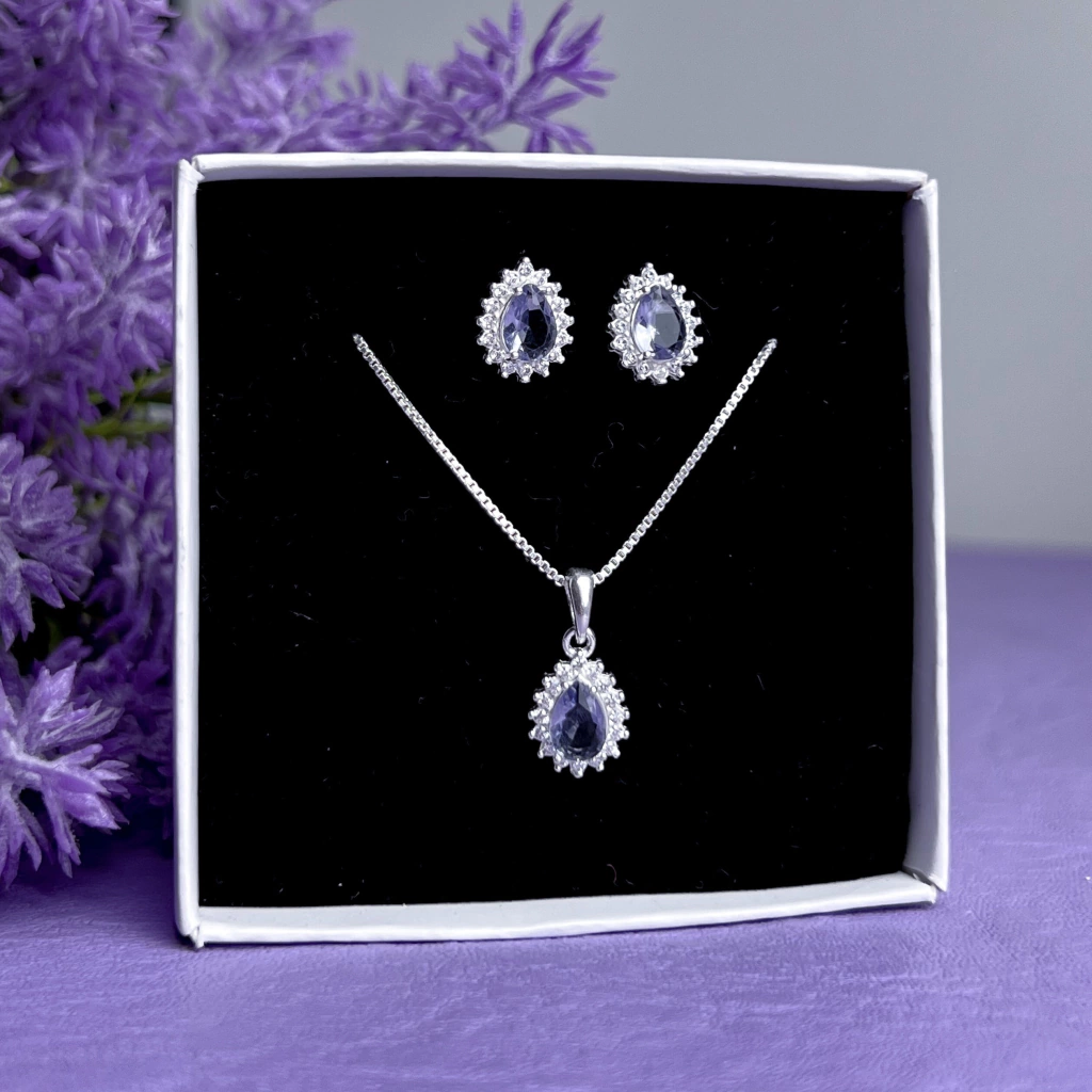 Deixe seu estilo ainda mais radiante com o encantador Conjunto Gota Cravejado Lilás! 💜✨