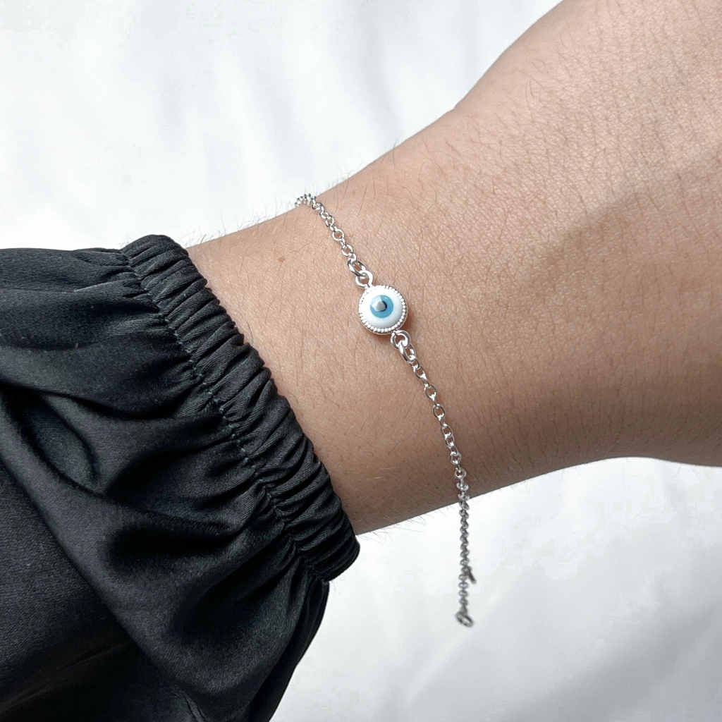 Feita em prata 925, essa pulseira minimalista não apenas encanta com seu design elegante, mas também traz proteção e boas energias para o seu dia a dia. O símbolo do olho grego é conhecido por afastar energias negativas, garantindo que você esteja sempre protegida.